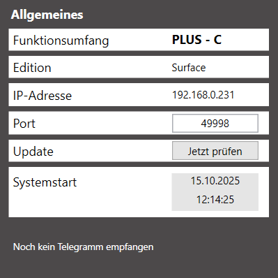 Funktionsumfang zeigt an, ob eine Plus Lizenz gefunden wurde. „C“ – Lizenz per Cloud bezogen. „D“ – Ein Dongle ist angeschlossen. „T“ – Ein TecStick ist angeschlossen. „A“ – Ihr Systemintegrator hat die Plus ______Features aktiviert.