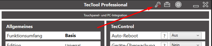Nach der Installation hat das TecTool seinen Basisumfang. Dieser kann durch den Erwerb einer „Plus“-Lizenz erweitert werden. Den exakten Umfang entnehmen Sie der nachfolgenden Tabelle. Den vollen Umfang können Sie jederzeit Testen, indem Sie den Schlüssel-Button in der Oberfläche betätigen: