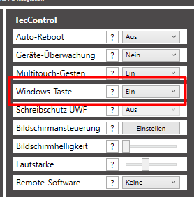 Bei einigen Geräten kann es notwendig sein, Windows-Taste zu deaktivieren. Z.B. ist diese über die Glasoberfläche der PEAKnx Touchpanels auslösbar, was dem Bediener ermöglichst aus der Bedienoberfläche auszubrechen. Ist dies nicht gewünscht, kann dies über die TecTool-Oberfläche sowie per Telegramm gesteuert werden.